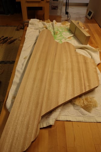 写真は富士額を制作するために一枚板を切って接着しているところです。両側からハタガネでしっかり固定します。