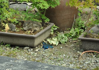 これは庭に来ていた綺麗なチョウ。カラスアゲハの一種でしょうか、もしかして初めて見たかもしれません。