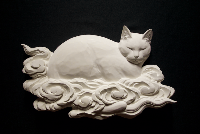 結局真っ白のようになっていますが、よく見ると雲と猫の色は変えてあります。濡れ色の状態で留められれば良いのですが難しい。雲など繧繝のようにも...全体を古色のようにも...やりたいことと出来ることの差が違い過ぎます。とにかくやってみる、経験した上で考えるということで、また違う彩色で挑戦してみるつもりです。