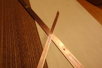 銅板から切り抜かれた”雷”を一度現物と合わせて調整と位置決めを行う。