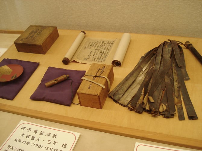 討ち入りの際に使用されたとされる采配、他 呼子鳥笛、盃